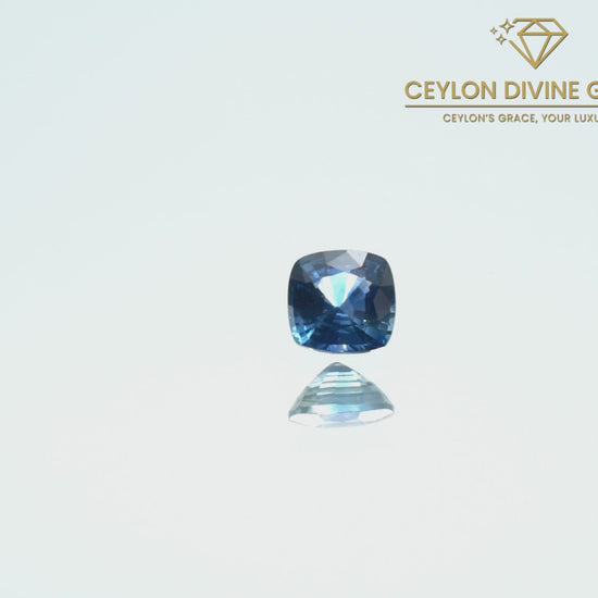 The gemstone has a cushion rectangular mixed cut and the color is blue.
