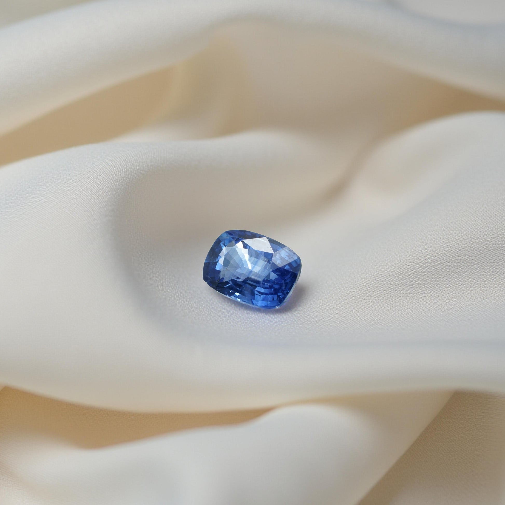 The gemstone has a cushion rectangular mixed cut and the color is blue.
